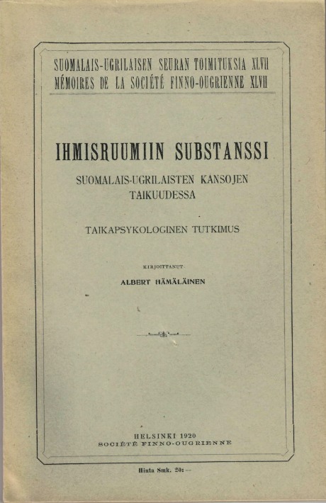 Ihmisruumiin substanssi suomalais-ugrilaisten kansojen taikuudessa. Taikapsykologinen tutkimus. Suomalais-Ugrilaisen Seuran Toimituksia XLVII. 1920. 162 p. 10 €. (Uusintapainos 2005, jonka kustantajana Psykiatrian Yhteistyö ry.)