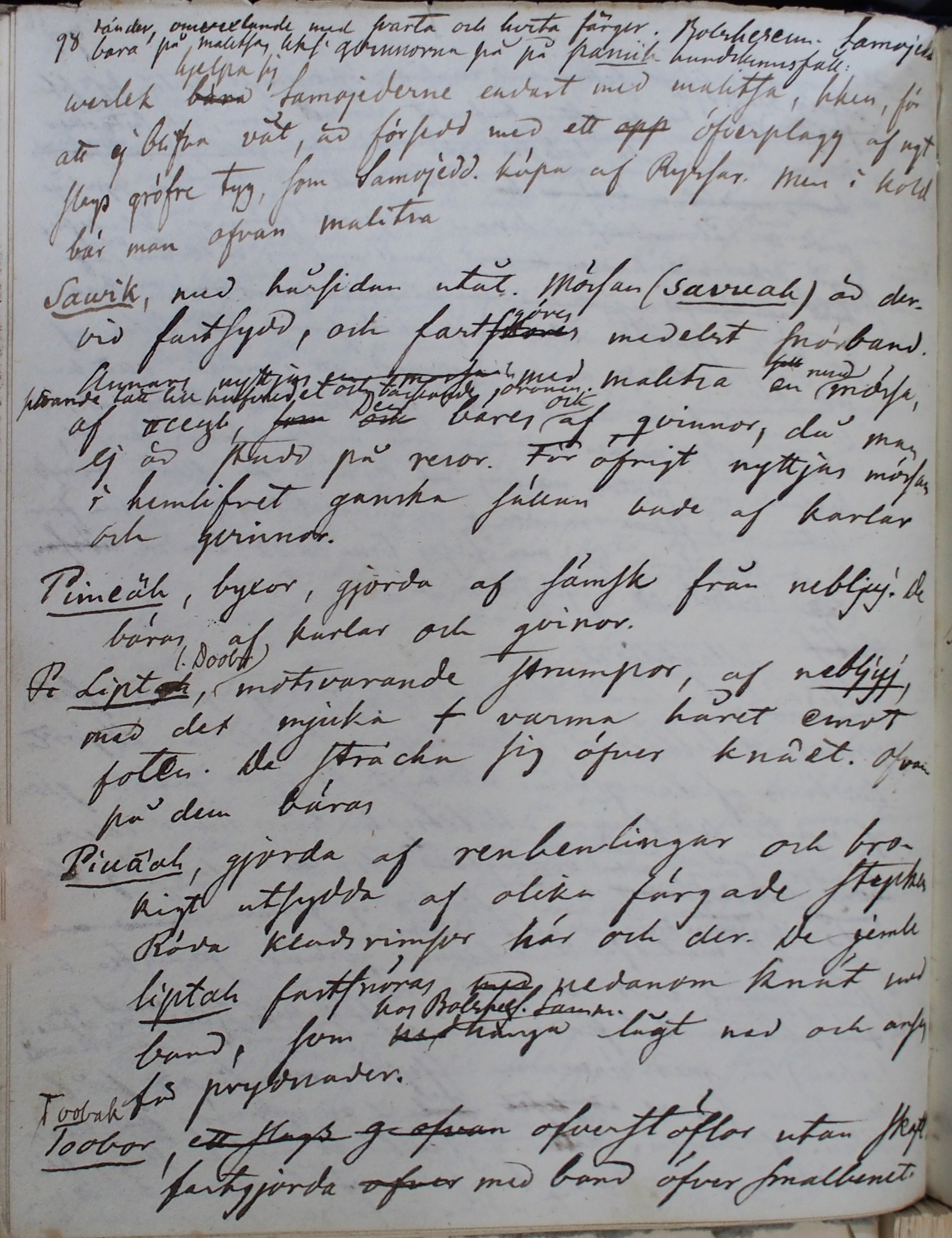 | ränder omvexlande med svarta och hvita färger. Bolshesem[elska]. Samojed[er]. bara på malitsas hsk[hundskinn]. qvinnorna på på paniih hundskinsfåll: werlek hjelpa sig Samojederne endast med malitsa, hken[hvilken], för att ej blifva våt, är försedd med ett öfverplagg af ngt[något] slags gröfre tyg, som Samojedd[er]. köpa af Ryssar. Men i kald bär man ofvan malitsa. |