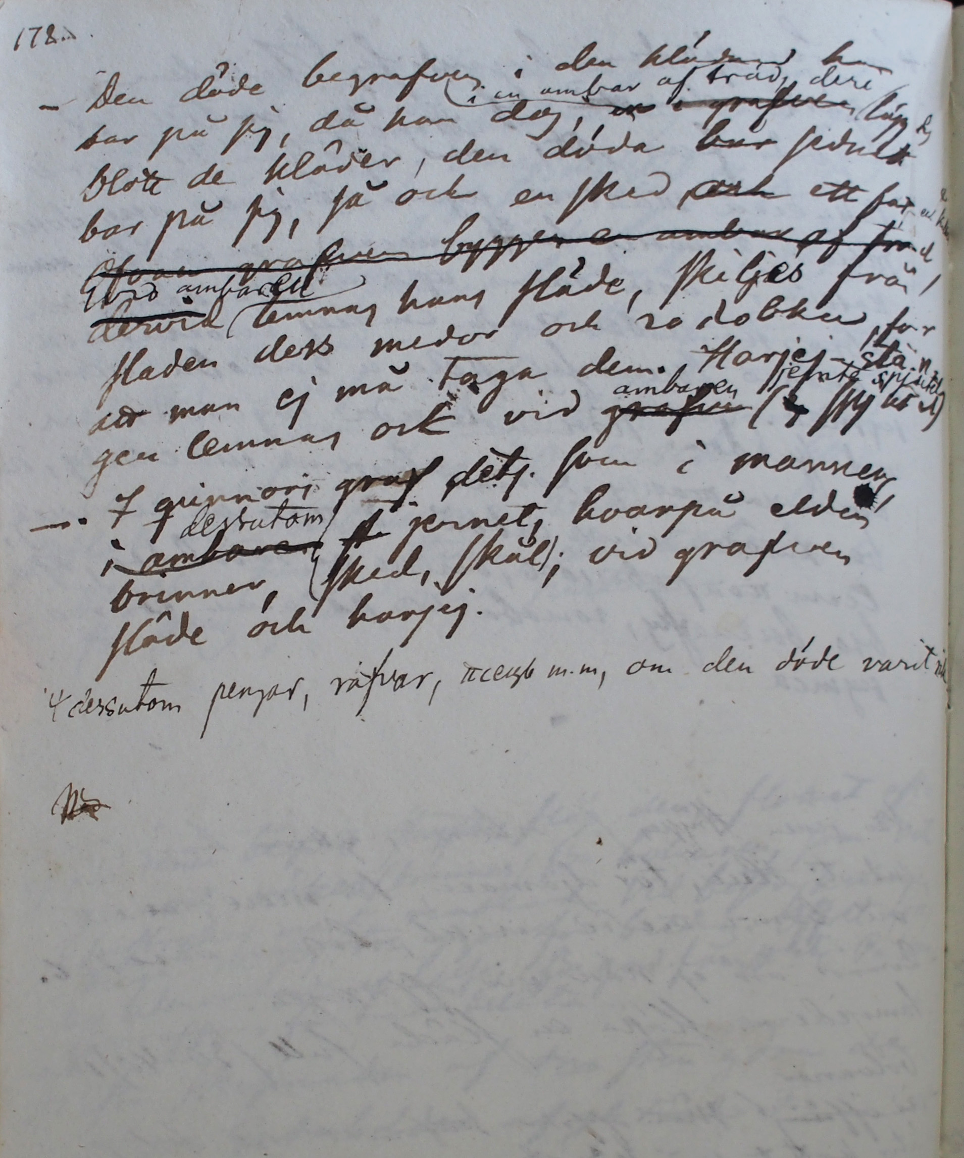 har på sig, då han dog i en ambar af träd, dere lägges, blott de kläder, den döda bär sednast bar på sig, så ock en sked, och ett fat. |