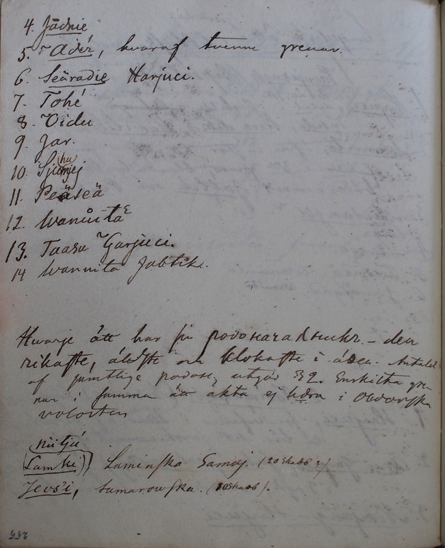 rikaste, äldste och klokaste i ätten. Antalet af somtlige родон[ачальников]. utgår 32. Enskilta gre- nar isamma ätt äkta ej hdra[hvarandra] i Obdorska volosten. (Lamki), Niitjú Laminska Samoj[eder]. (20 skattb[etalande].?) Jevs'i, Samarowska. (10 skattb[etalande].) |