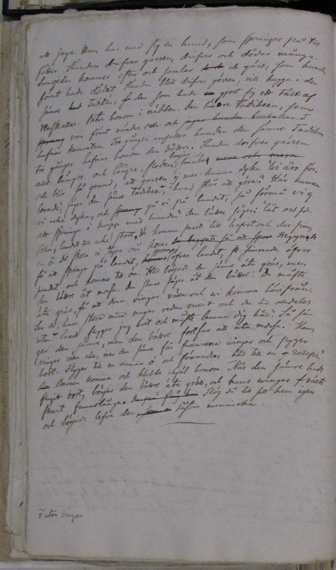 att jaga. Han har med sig en hund, some springer på tre fötter. Hunder drifver gässen, drifver och dödar många. Samojeden kommer efter och samlar de gäss, som hunden förut hade dödat. Hunden blott drifver gässen, vill hugga i den sämre #Deletion: kud Tadibén, den som hade gjort sig ett tält af renskallar. Biter honom i näbben. Den bättre Tadibeen, som #Deletion: sprang var förut vänder om och #Deletion: jagar hunden tillbaka T befirar kamraten. Tre gånger anfaller hunden den sämre Tadiben, tre gånger befriar honom den bättre. Hunden drifver gässen allt längre och längre, floden börjarAddition smalna #Deletion: mera och mera och blir så grund, att gässen ej mer kunna dyka. "Wi äro förlorade", säger den sämre Tadiben, "hvad står att göra?" Här kunna vi icke dyka, och #Deletion: springa gå vi på landet, så förmå vi ej att springa i kapp med hunden." Den bättre säger: "Låt oss försöka; landet är icke stort. Vi komma snart till hafvet och der finns en ö. Dit skola vi styra vår kosa. #Deletion: De begynnte så att springa Begynnte så att springa på landet, #Deletion: kommosprungoAddition öfver landet, simmade öfver sundet och kommo till ön. Här började den sämre äta gräs, men den bättre åt mossa. Den sämre säger åt den bättre: "Du måste äta gräs, så att dina vingar växa och wi komma härifrån. Ser du, huru stora mina vingar redan vuxit, och du är alldeles utan. Snart flyger jag bort och måste lemna dig här." Så säger den sämre, men den bättre fortfar att äta mossa. Hans vingar växa icke, men den sämre får fullvuxna vingar och flyger bort. Flyger till en annan ö och förvandlas här till en гагарь! Note by Castrén: F. utan vingar. Barnen komma och klubba ihjäl honom. När den sämre hade flugit bort, börjar den bättre att äta gräs, och hans wingar växte snart famnslånga. #Deletion: Derpå flög han Flög så till sitt hem igen och började lefva der #Deletion: som en såsom menniska.