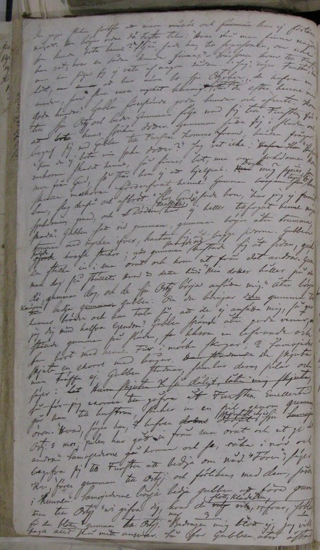 Den yngre flickan fortfor att mållös och kan Unclear ej förtära något. Hon börjar redan dö. Fursten talar: "Hvar må man finna någon som kunde bota henne? Gån, sade han, till svärsonen, om icke han vet, hvar en sådan kunde finnas." -Svärsonen kom till Fursten, men han säger sig ej veta af någon sådan. "Jag," säger Fursten, "har hört #Deletion att här nära bo sju Ostjaker, de hafva en moder, som skall vara mycket kunnig. Svärson!Addition Far du efter henne med goda hundar." Gubben förespände goda hundar och afreste. Kom till sju Ostj. och beder Gumman följa med sig till Fursten för att bota hans sjuka dotter. Gumman satte sig i släden och begaf sig med Gubben till Fursten. Kommo fram, knäsen frågar: "Kan du ej bota min sjuka dotter?" Jag vet icke: #Deletion: Hafva sköHafva mskorna skadat henne, så finnes bot, men om sjukdomen kommer från Gud, så står hon ej att hjelpas. #Deletion: Men Dock synes mig, som skulle mskorna förderfvat henne." Gumman #Deletion: börjar sk tager sinAddition baraban, slog derpå och afbröt: "Hos Gud," sade hon "har jag ej funnit sjukdomens grund, och Döden (Haabtseh)Addition, har ej heller tillfogat henne någon skada." Gubben satt vid gumman, gumman börjar åter trumma, trummar med mycken ifver, kastar sig åt begge sidorna. Gubben #Deletion: gjorde täljde hvassa stickor; när gumman slängde ochAddition kastade sig åt sidan, gick en stick in i ena örat och kom ut från det andra. Gumman dog på stället. Hvad är detta här: "Min dotter håller på att dö, gumman dog, och de sju Ostj. börja ansätta mig." Åter börjar Knäsen bedja #Deletion: gumman gubben: Om du bringar dnaUnderlined by Castrén gumma till hennes bröder och kan tala så, att de ej ansätta mig, så ger jag dig min halfva egendom." Gubben spände åter goda renar, ställde gumman på släden, liksom en lefvande och for bort med henne. Far i mörka skogar, 2 Samojeder skjuta en ekorre med bågar. #Deletion: Han stadnadeDe skjuta men träffa ej. Gubben stadnar, samlar deras pilar och säger: #Deletion: Ut Huru skjuten K så dåligt, låten mig skjuta, så för jag ekorren till gåfva åt Fursten. Emellertid går han till hustrun, sticker in en pil genom gummans öron. "Hvad, säger han, I hafven #Deletion: dödat dödatskjutit ihjälAddition sju #Deletion: Samoje Ostj:s mor, pilen har gått in från ena örat och ut ge. den andra." Samojederna #Deletion: gå komma och se, råka i nöd och begifva sig till Fursten att bedja om nåd. "Fören," säger Kn., "fören gumman till Ostj. och förlikens med dem, såsom i Kunnen." Samojederne börja bedja gubben att föra gummen till Ostj. "Wi gifva dig, hvad du #Deletion: vilja och räfvar, soblar, flott, kläde m.m.Addition, för du blott gumman till Ostj. "Bedragen mig blott ej, jag vill taga allt på mitt ansvar. Så far Gubben åter åstad